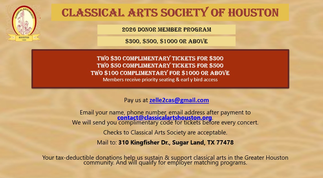 Donations to the Classical Arts Society of Houston can be made using the link below and are tax-deductible.